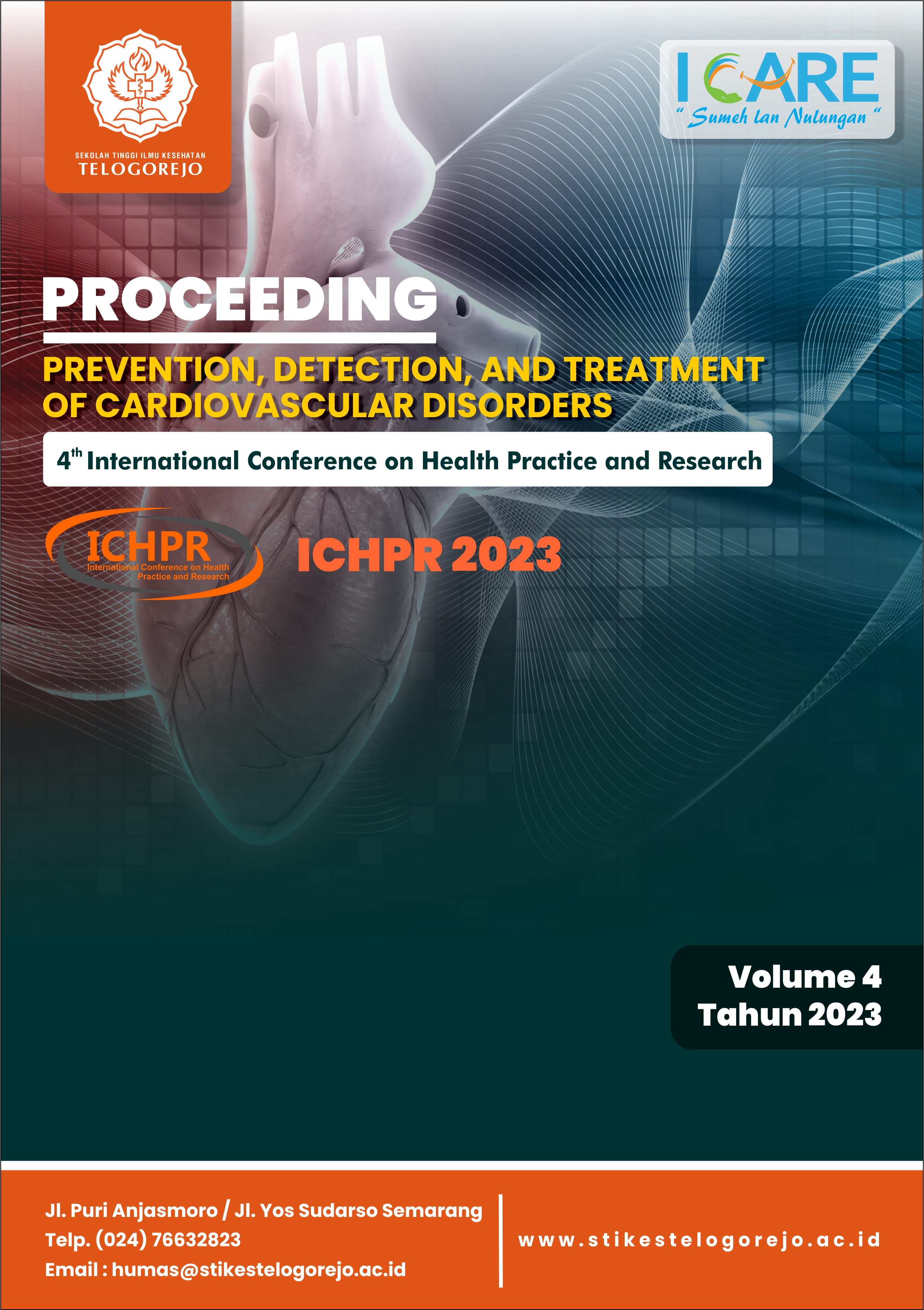 Vol. 4 (2023)The 4th International Conference Of Health Research (ICHPR) is an annual conference event held by STIKES Telogorejo Semarang. This activity facilitates researchers to publish their research results. The theme taken in this event isis Prevention, Detection and Treatment Of Cardiovascular Disorders 2023. Cardiovascular disease mostly attacks the productive age group so that its death leaves economic and social burden on society. The Association of Indonesian Cardiovascular Specialists (PERKI), which was founded in 1957 as a forum for specialists in heart and blood vessels, has worked actively in various lines to play a role in the movement to overcome cardiovascular disease in Indonesia. Despite being a leading cause of death and disability providing access to cardiovascular disease, drugs is still lacking on the national and global agenda. The high rate of cardiovascular disease and barriers to access health services are associated with various socioeconomic determinants of health, including health education and awareness. Therefore, the issue above encourages the existence of an international conference with the theme “INTERNATIONAL CONFERENCE OF HEALTH RESEARCH PREVENTION, DETECTION AND TREATMENT OF DISORDERS CARDIOVASCULAR.