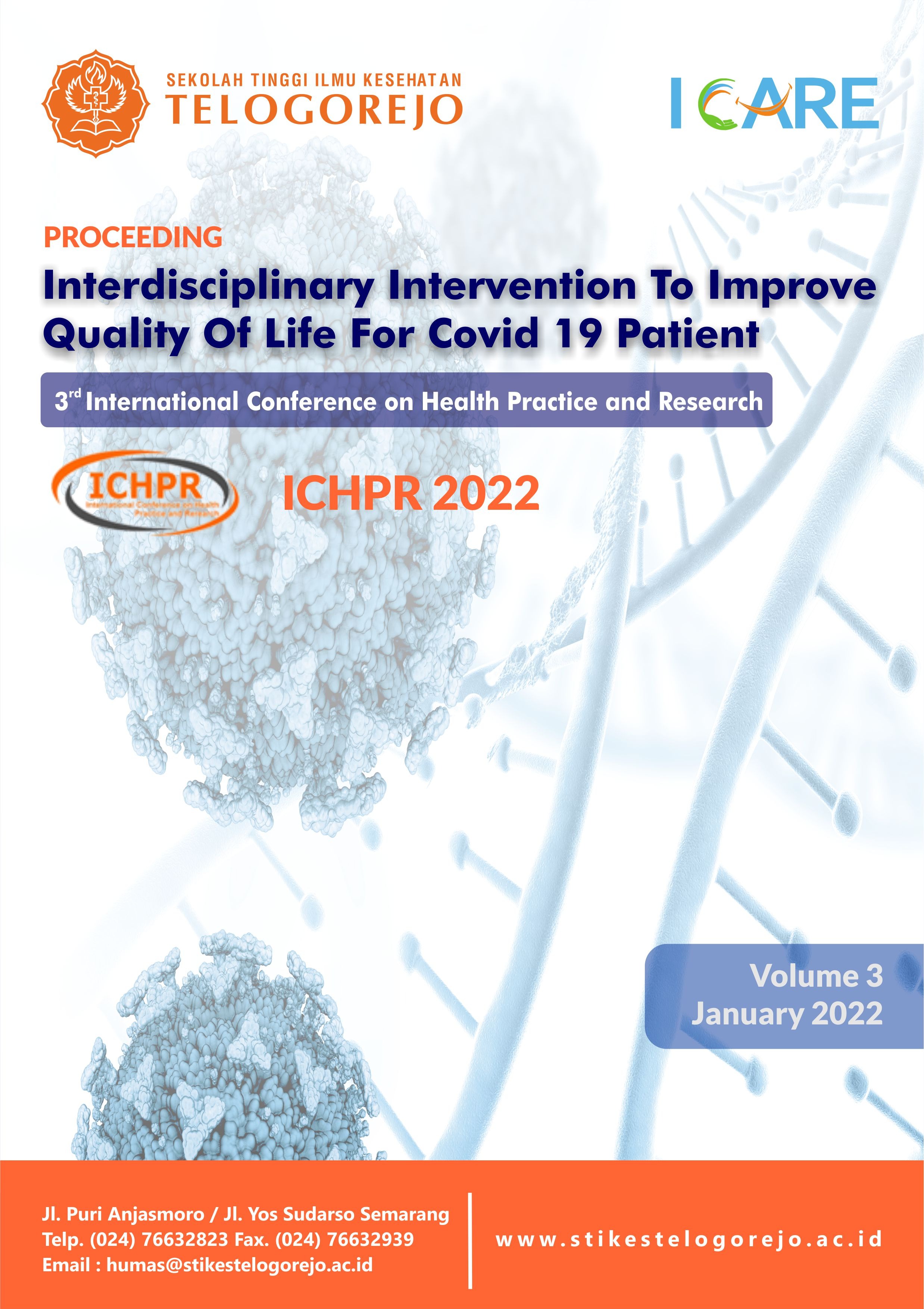 Vol. 3 (2022)The theme of this conference is “Interdisciplinary Intervention to Improve Quality of Life for Covid-19 Patient”. At the third International Conference focused intervention to improve quality of life for Covid 19 patient so the theme taken was “Interdisciplinary Intervention to Improve Quality of Life for Covid-19 Patient”. STIKES Telogorejo expected to improving knowledge and understanding in providing health services for an “Covid 19 patient”. The conferences also held to increasing academic nuance through the publication of academic’s and health professional’s research. We hope this conference will contributing to the development of health care knowledge.